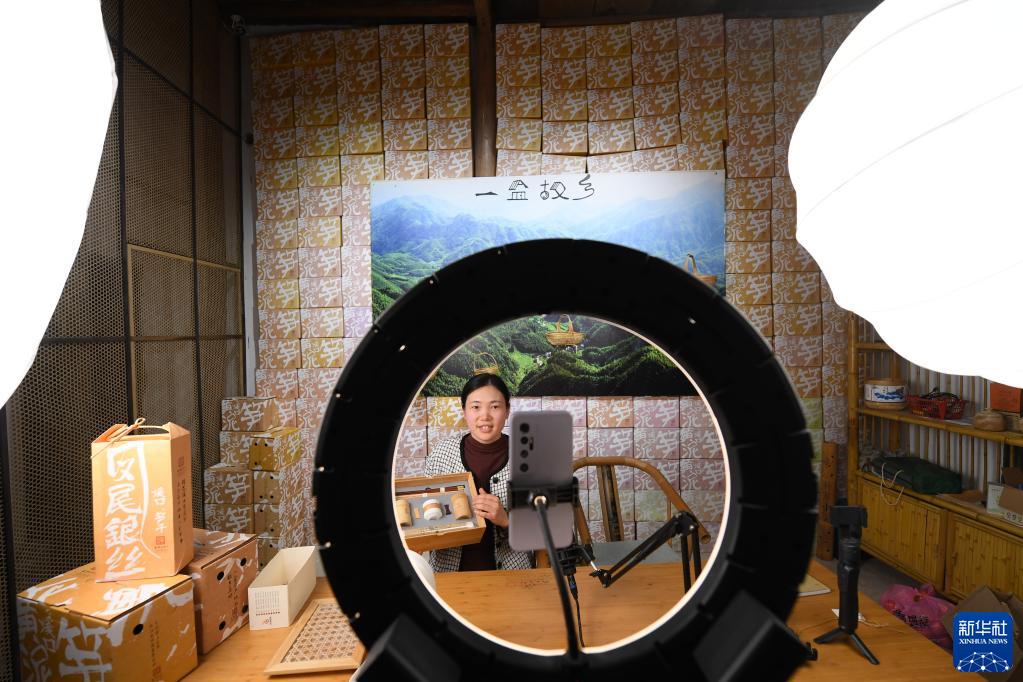 4月3日,鄒霞在直播間介紹一款由當地黃茶、紅木筷子、皮紙和手工竹編結合的產(chǎn)品。新華社記者 翁忻旸 攝