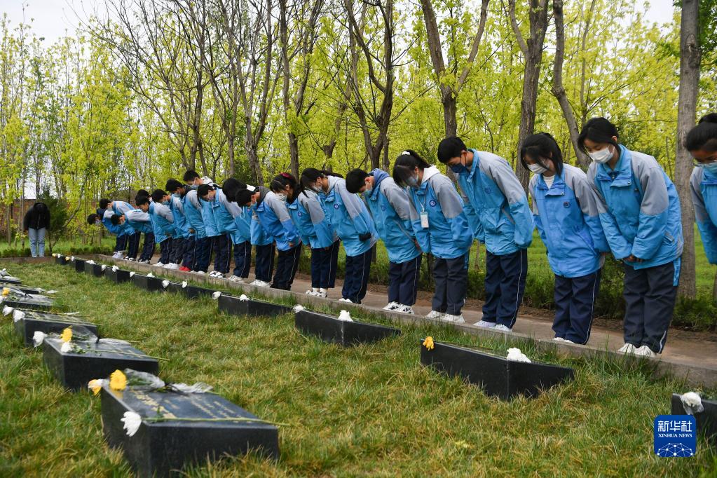 4月4日,在陜西省興平市烈士陵園,興平市秦嶺中學(xué)學(xué)生向烈士紀念碑鞠躬。