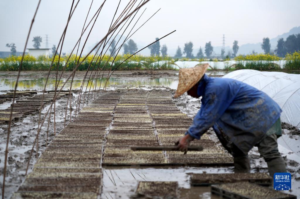 4月4日,在浙江省樂(lè )清市城東街道振海村的一片集中育秧農田里,農民在擺放秧盤(pán)。