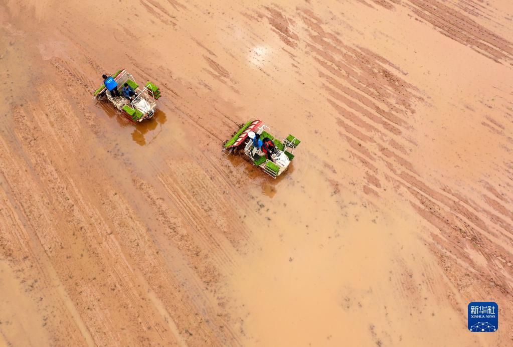 4月4日,四川省廣安市鄰水縣袁市鎮農民駕駛插秧機在田間作業(yè)(無(wú)人機照片)。