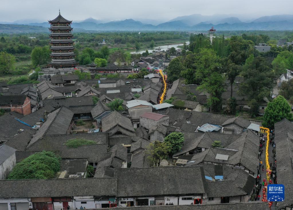 當日,崇州元通清明春臺會(huì )在四川成都崇州市元通古鎮拉開(kāi)帷幕。由269人手舉269截龍身匯聚成的“匯江老龍”,在古街上巡游。