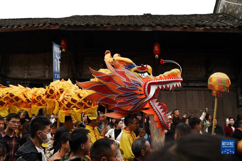 當日,崇州元通清明春臺會(huì )在四川成都崇州市元通古鎮拉開(kāi)帷幕。由269人手舉269截龍身匯聚成的“匯江老龍”,在古街上巡游。
