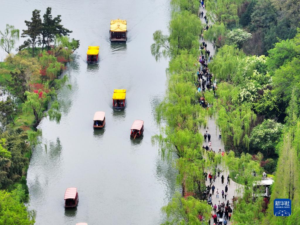 4月5日,游客在江蘇揚州瘦西湖風(fēng)景區游玩(無(wú)人機照片)。