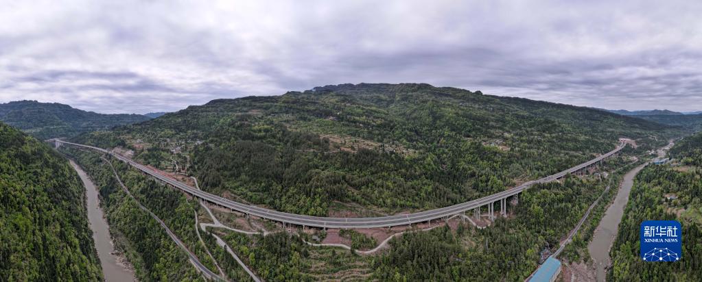 這是4月5日拍攝的鎮廣高速公路王坪至通江段局部(無(wú)人機全景照片)。
