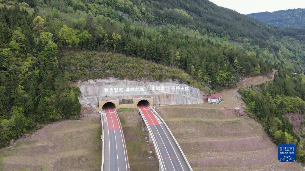 這是4月5日拍攝的鎮廣高速公路王坪至通江段一隧道口,上面裝飾有當年紅軍在巴中毛浴鎮政府院壩前的青石墻上鏨刻的“智勇堅定、排難創(chuàng )新、團結奮斗、不勝不休”十六字訓詞(無(wú)人機照片)。