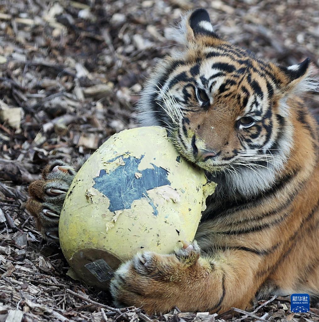 4月5日,在英國倫敦動(dòng)物園,一只蘇門(mén)答臘虎享用“彩蛋大餐”。