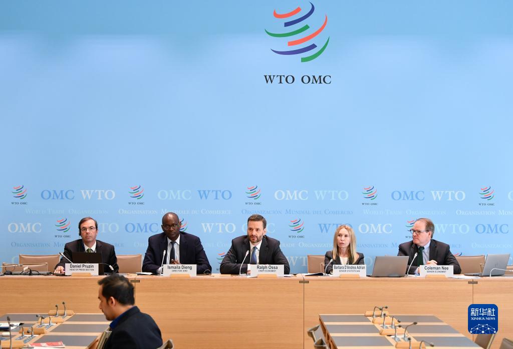 4月5日,在瑞士日內瓦的世貿組織總部,世貿組織首席經(jīng)濟學(xué)家拉爾夫·奧薩(中)在新聞發(fā)布會(huì )上講話(huà)。