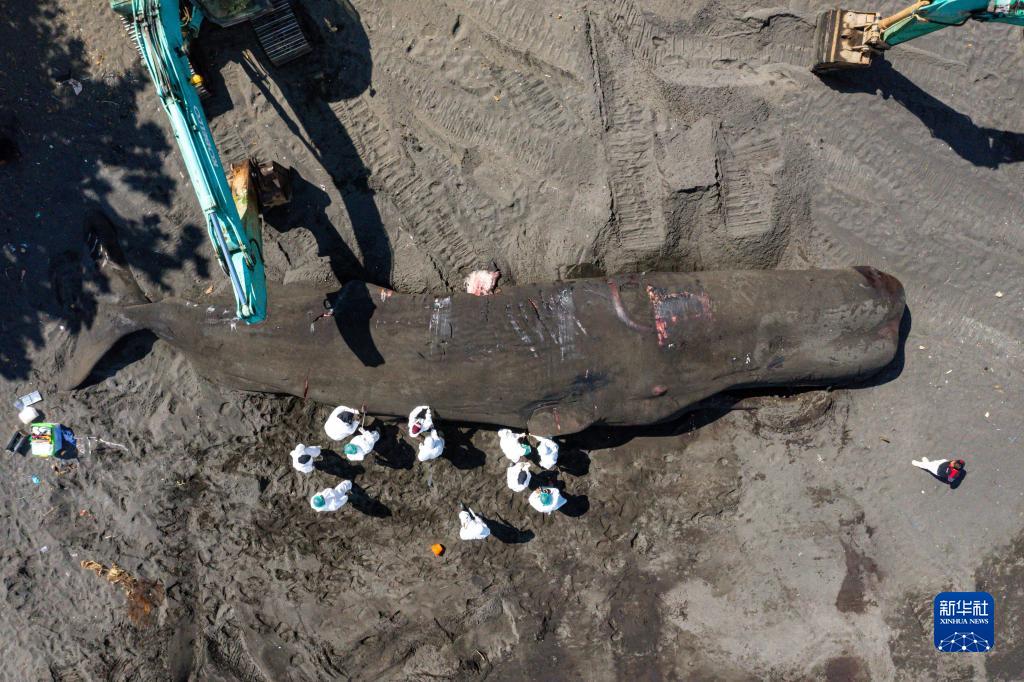 4月6日,在印度尼西亞巴厘島克隆孔,工作人員對抹香鯨的遺體進(jìn)行醫學(xué)檢測(航拍照片)。