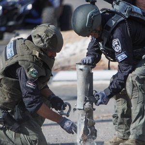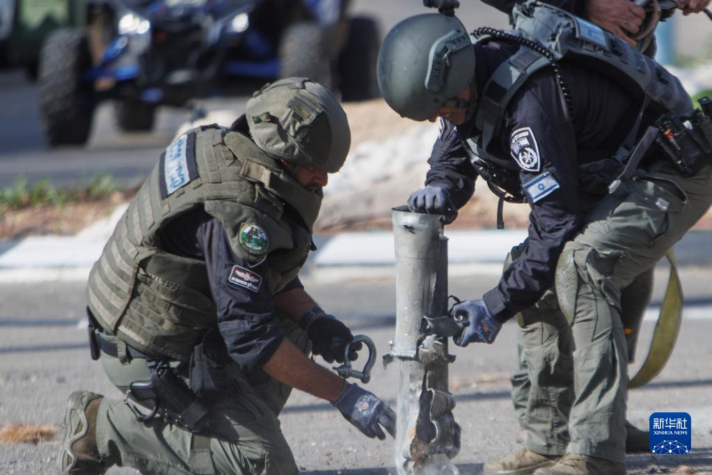 4月6日,在以色列北部的什洛米鎮,安全人員處理一枚火箭彈。