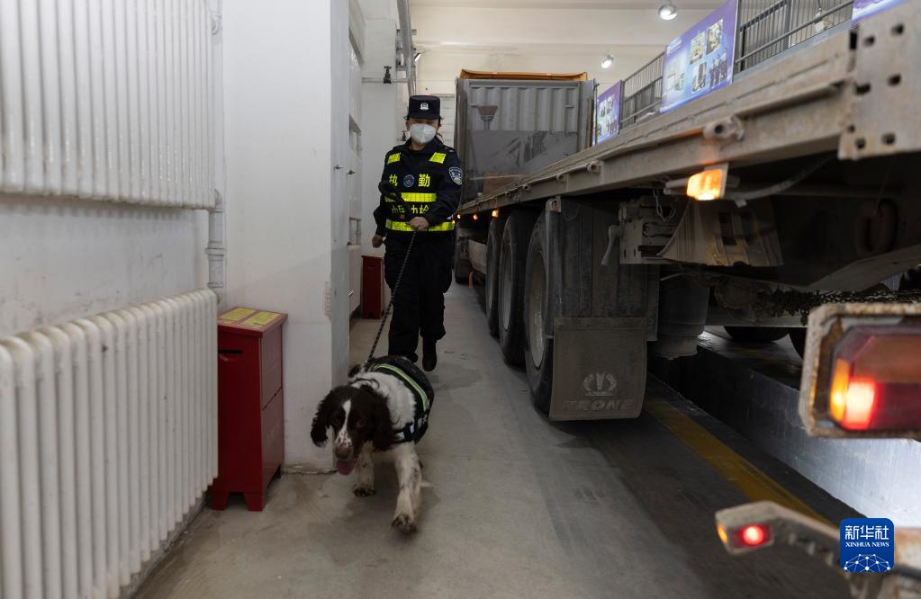 4月4日,劉欣和警犬康欣進(jìn)行車(chē)體檢查。新華社記者 費茂華 攝
