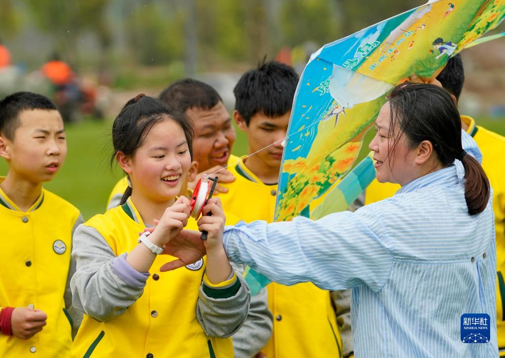 3月31日,重慶廣陽(yáng)島的一片草地上,重慶市特殊教育中心的老師李英(右一)在指導視力障礙學(xué)生如何放風(fēng)箏。
