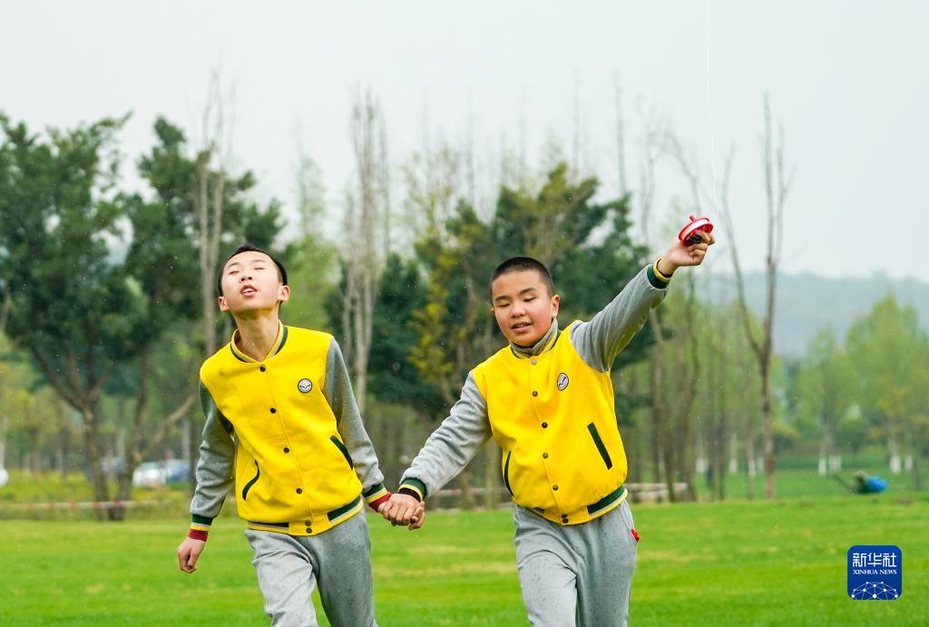 3月31日,重慶廣陽(yáng)島的一片草地上,重慶市特殊教育中心視力障礙的學(xué)生們牽著(zhù)手放風(fēng)箏。