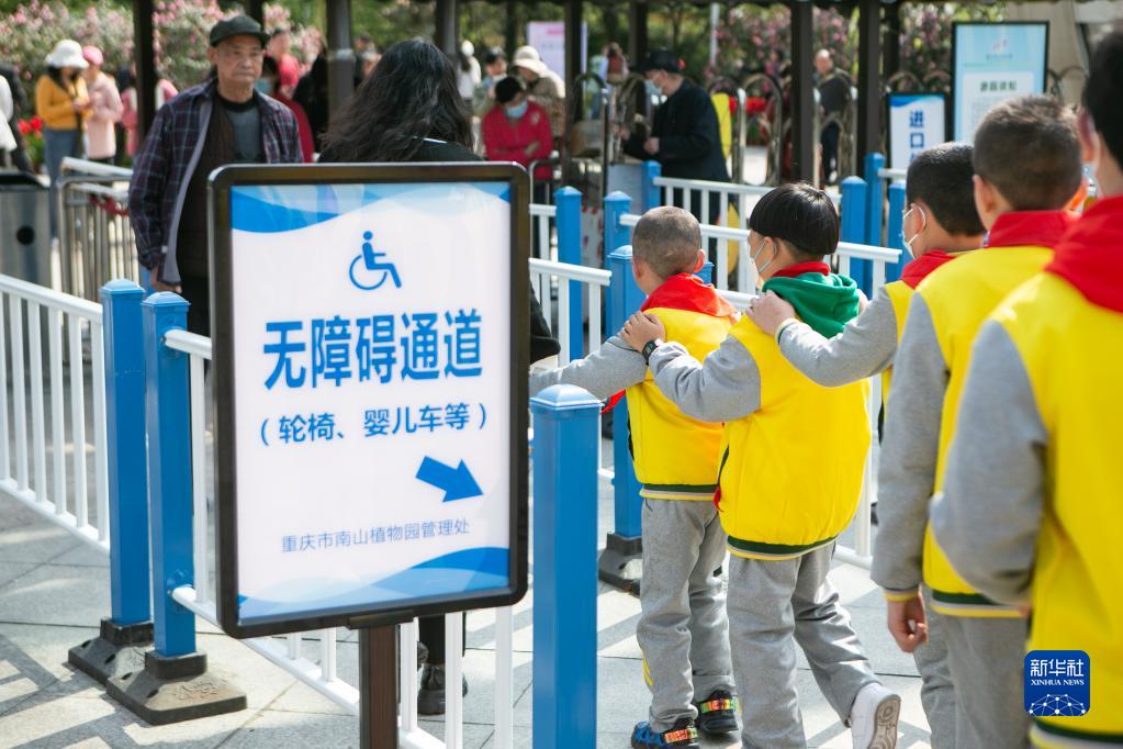 3月14日,重慶市特殊教育中心的視力障礙學(xué)生從無(wú)障礙通道進(jìn)入重慶市南山植物園。