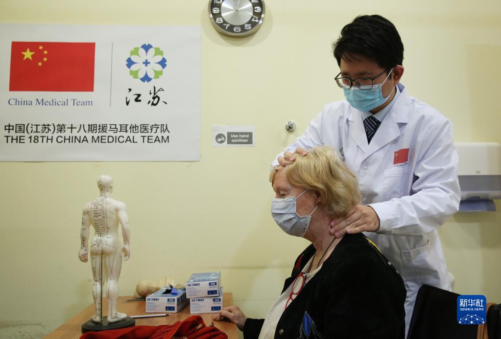 4月5日,在馬耳他保拉市地中海地區中醫中心,中國第18期援馬耳他醫療隊成員為一名女士進(jìn)行推拿治療。