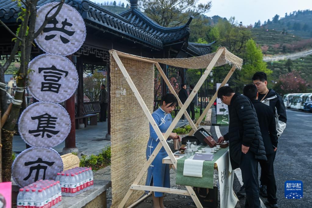 4月7日,工作人員在安頂村的春季共富集市上展示茶葉等當地土特產(chǎn)。