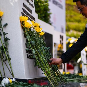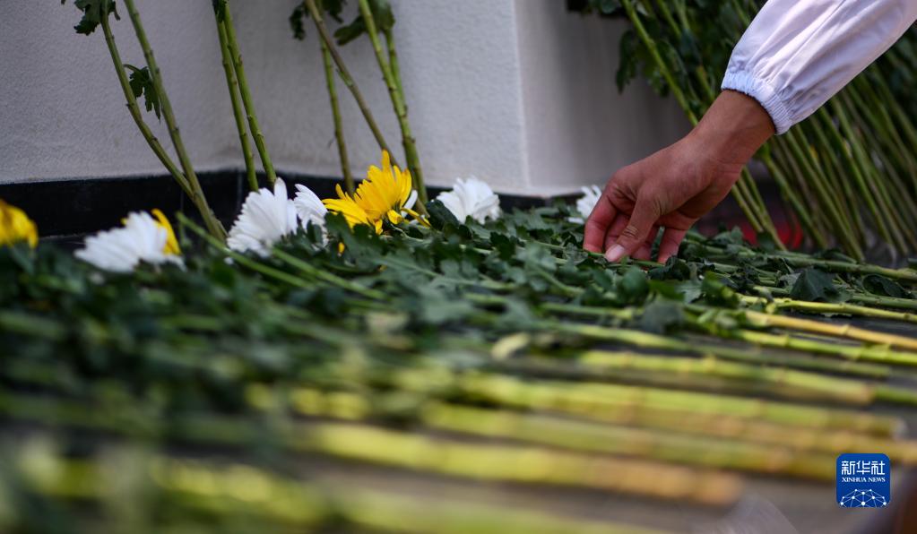 4月7日,參加活動(dòng)的志愿者在現場(chǎng)獻花。
