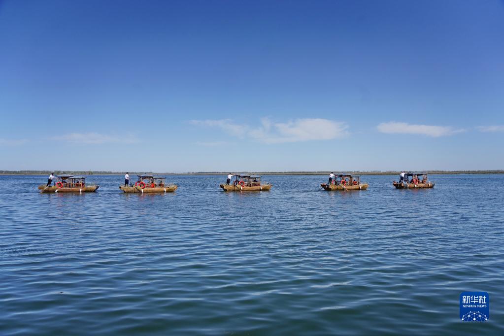 4月7日,處于試運營(yíng)階段的白洋淀“水上巴士”項目生態(tài)木船在白洋淀內行駛。