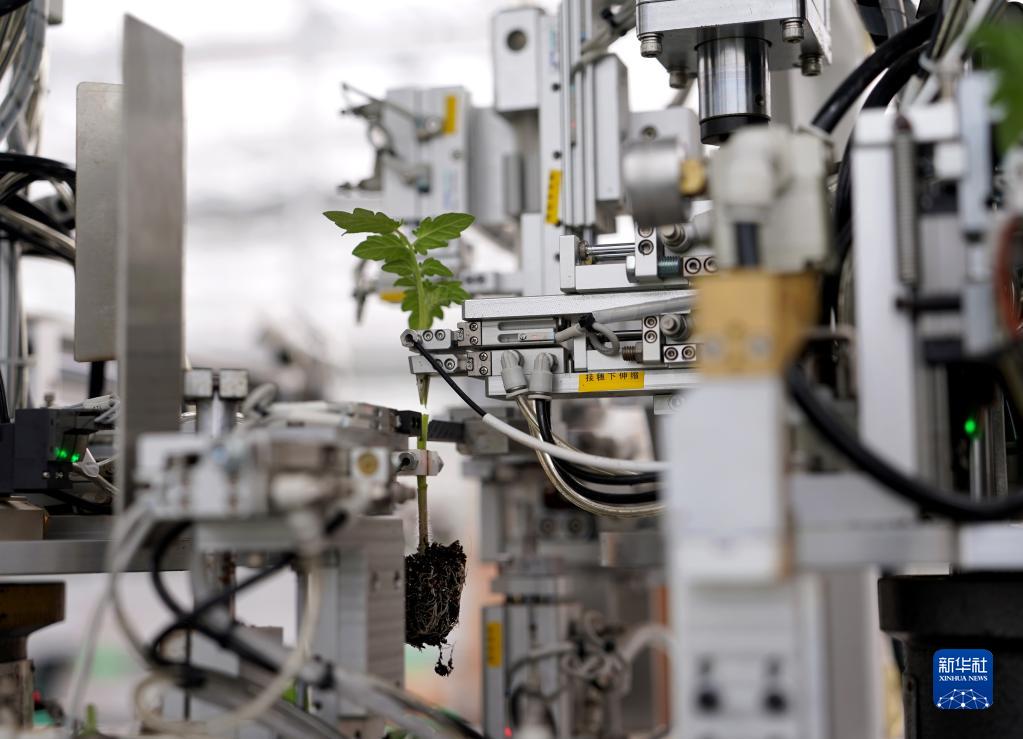 4月7日,在浙江省桐鄉市石門(mén)鎮的桐信種苗“未來(lái)農場(chǎng)”,農場(chǎng)研發(fā)的自動(dòng)嫁接機在嫁接西紅柿苗。