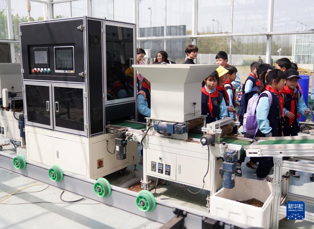 4月7日,在位于浙江省桐鄉市石門(mén)鎮的桐信種苗“未來(lái)農場(chǎng)”,開(kāi)展研學(xué)活動(dòng)的小學(xué)生參觀(guān)農場(chǎng)研發(fā)的智能精量播種機。