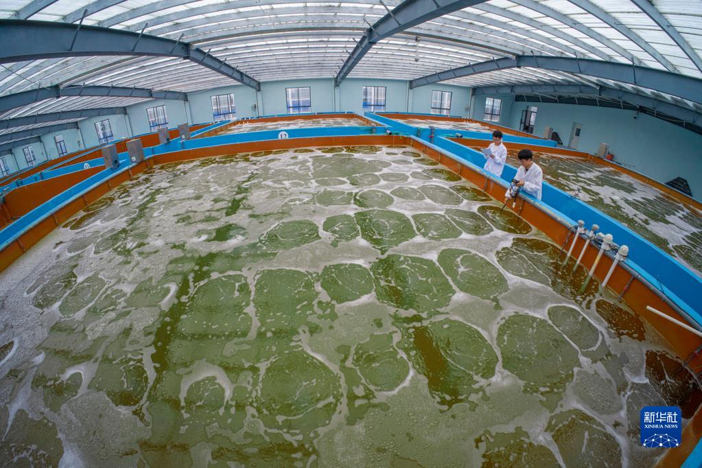 4月7日,在位于浙江省溫州市龍灣區圍墾南片的永興對蝦“未來(lái)漁場(chǎng)”,技術(shù)人員在養殖場(chǎng)內校準水質(zhì)。