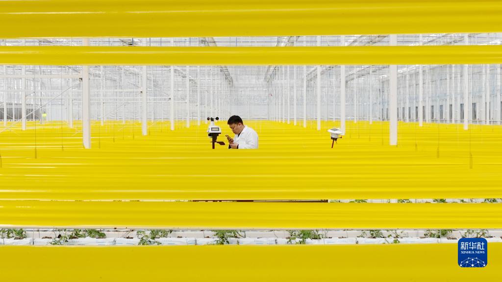 4月7日,在浙江省湖州市德清縣阜溪街道龍勝村水木“未來(lái)農場(chǎng)”,技術(shù)人員觀(guān)察番茄智能大棚光照數據(無(wú)人機照片)。