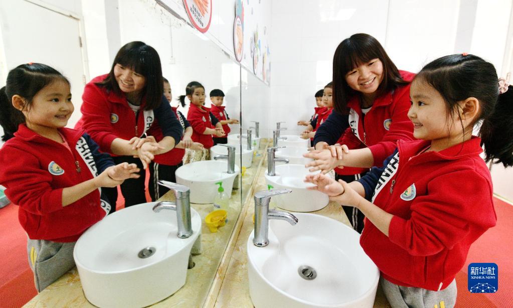 4月7日,在河北省石家莊市欒城區第一幼兒園,小朋友在老師指導下學(xué)習“七步洗手法”。