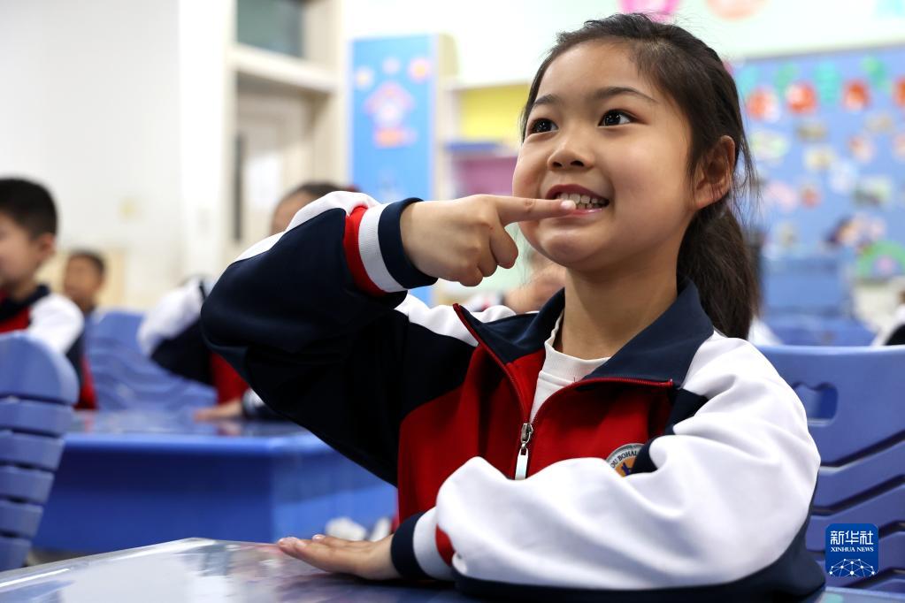 4月7日,山東省濱州市渤海中學(xué)南校區的學(xué)生在學(xué)習正確的刷牙方式。