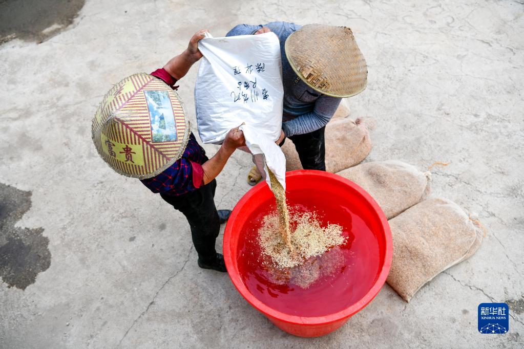 4月6日,貴州省岑鞏縣水尾鎮一雜交水稻種植大戶(hù)在浸泡稻種,為雜交水稻育苗做準備。