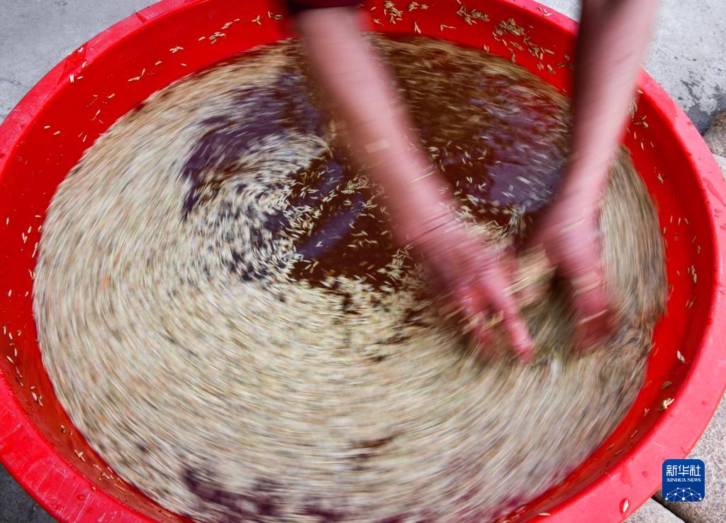 4月6日,貴州省岑鞏縣水尾鎮一雜交水稻種植大戶(hù)在浸泡稻種,為雜交水稻育苗做準備。