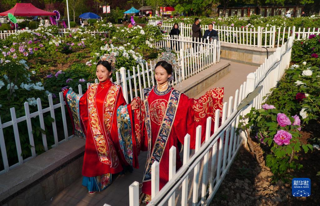 4月7日,游客在山東省菏澤市牡丹區的曹州牡丹園游玩。