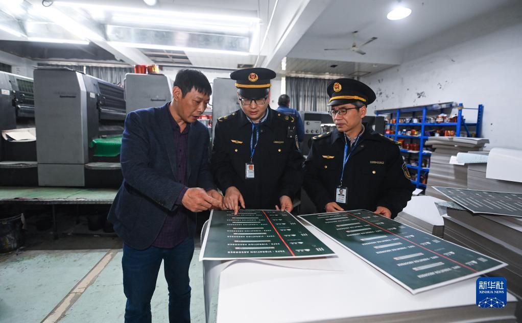 4月7日,諸暨市文化市場(chǎng)行政執法隊的工作人員在檢查印刷企業(yè)印刷品內容是否規范。