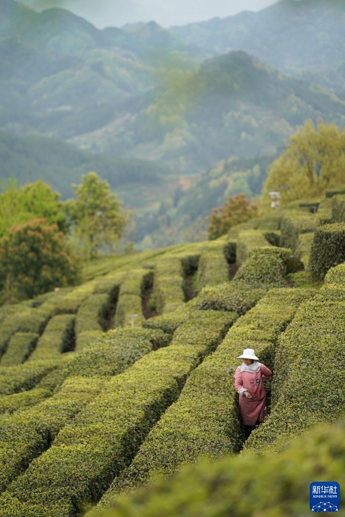 4月5日,茶農在漢中市南鄭區牟家壩鎮一處茶園采摘茶葉。
