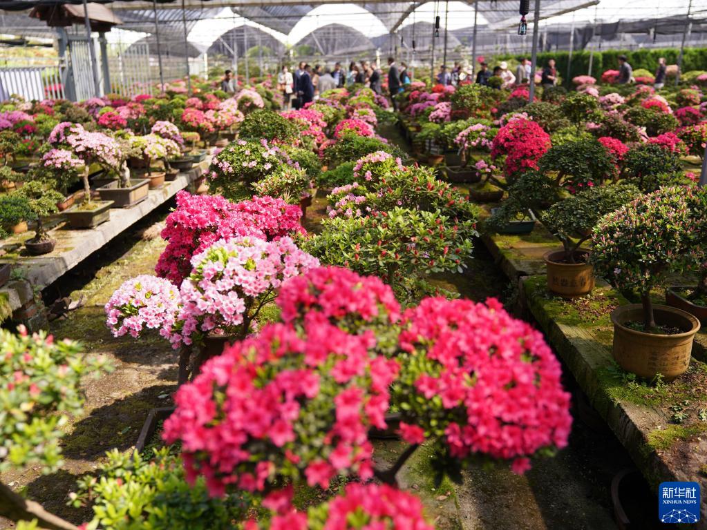 4月8日,游客在嘉善縣大云鎮碧云花園的精品杜鵑盆景坊內參觀(guān)。