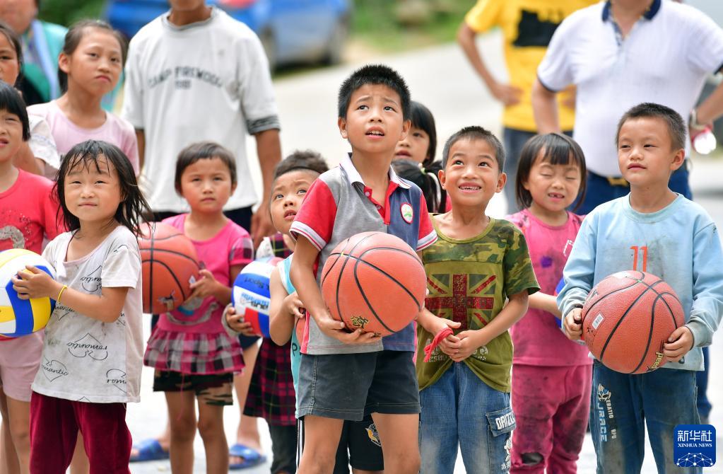 2019年7月27日,桂黔烏英苗寨的小學(xué)生練習投籃。