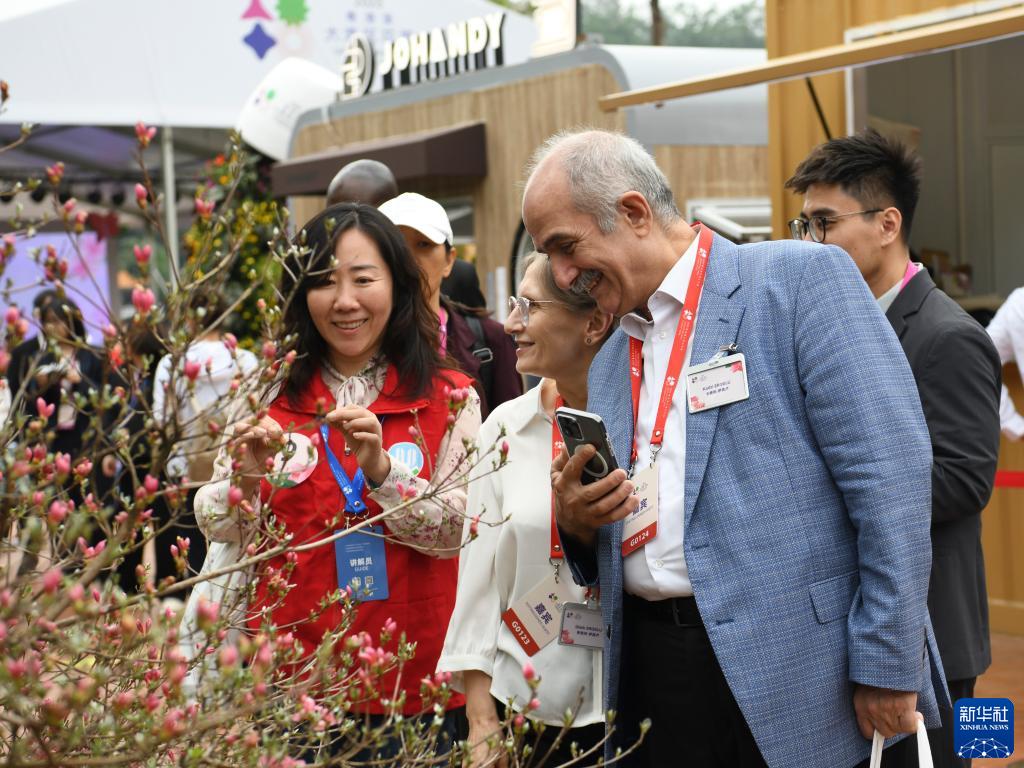 4月8日,外國嘉賓在2023粵港澳大灣區花展現場(chǎng)賞花。