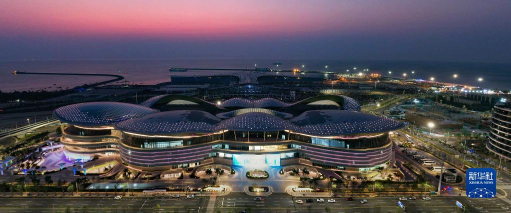 夜色中的??趪H免稅城(前)和??谛潞8劭瓦\綜合樞紐項目(后)(4月4日攝,無(wú)人機照片)。