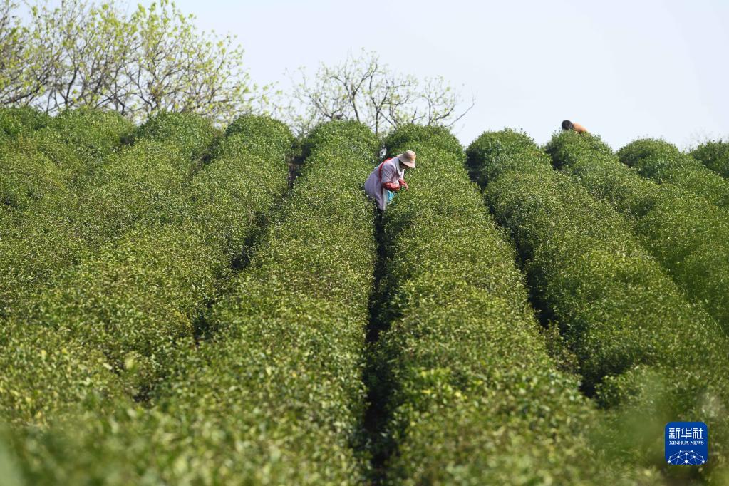 4月7日,采茶工在敬亭山山腳下的一處茶園里采摘茶葉。