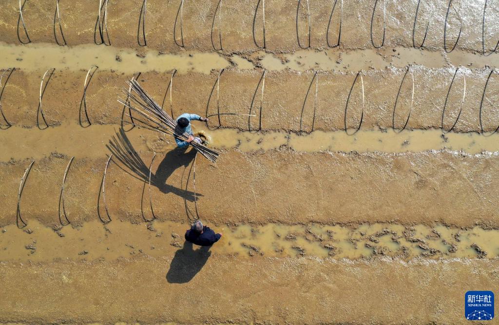 4月8日,村民在貴州省岑鞏縣天星鄉東興村雜交水稻制種基地搭建膜棚(無(wú)人機照片)。