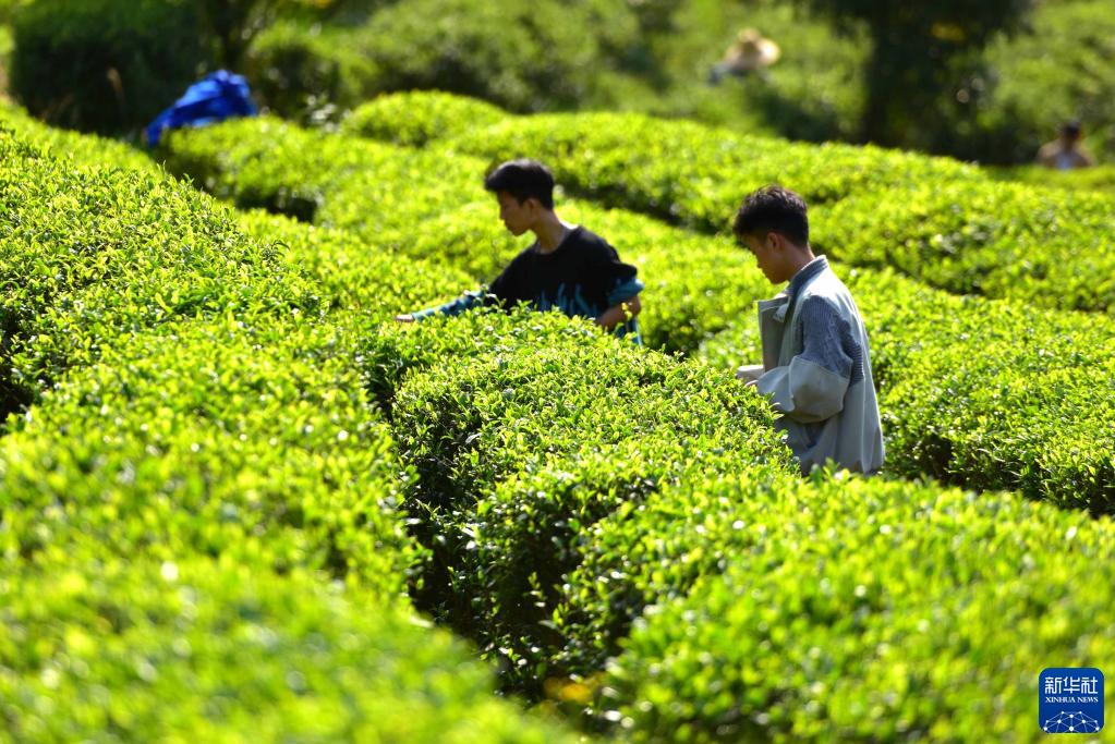 4月8日,人們在貴州省黔東南苗族侗族自治州丹寨縣龍泉鎮馬寨村茶園里采摘春茶。