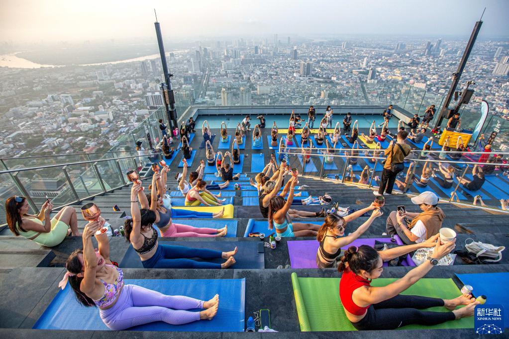 當日,數十名瑜伽愛(ài)好者在曼谷王權云頂大廈頂層觀(guān)景平臺體驗高空瑜伽。
