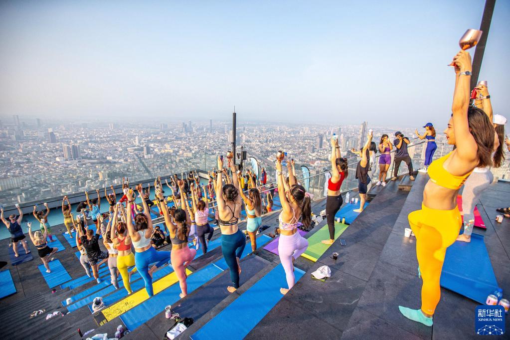 當日,數十名瑜伽愛(ài)好者在曼谷王權云頂大廈頂層觀(guān)景平臺體驗高空瑜伽。