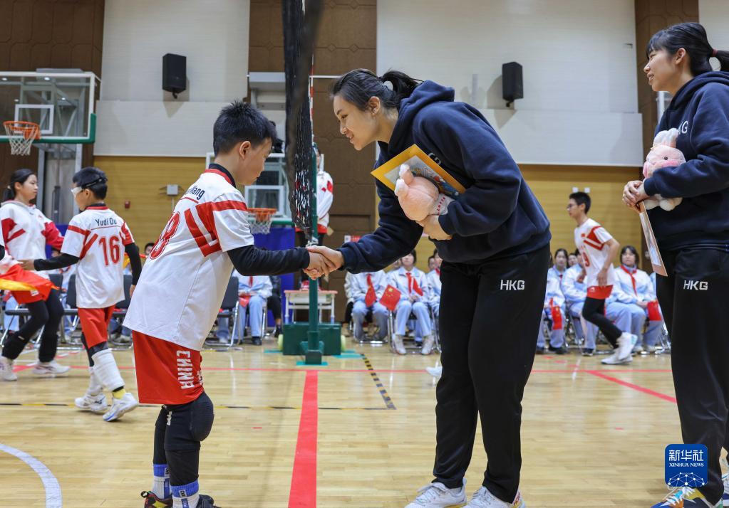 4月6日,人大附中分校小學(xué)部排球隊員和香港女排隊員在友誼賽前握手。