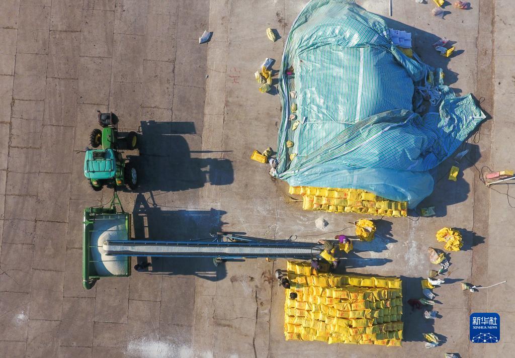 4月8日,在位于黑龍江省北安市的北大荒集團建設農場(chǎng)有限公司,拖拉機在裝運肥料(無(wú)人機照片)。