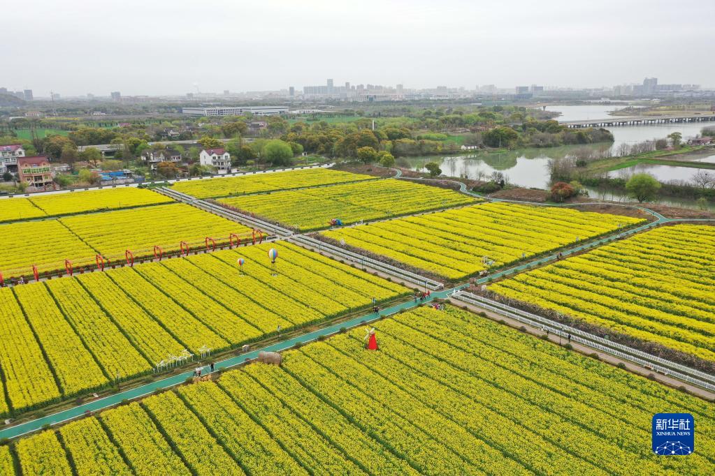 游客在浙江省湖州市吳興區八里店鎮移沿山生態(tài)景區的油菜花海游玩(2023年3月25日攝,無(wú)人機照片)。