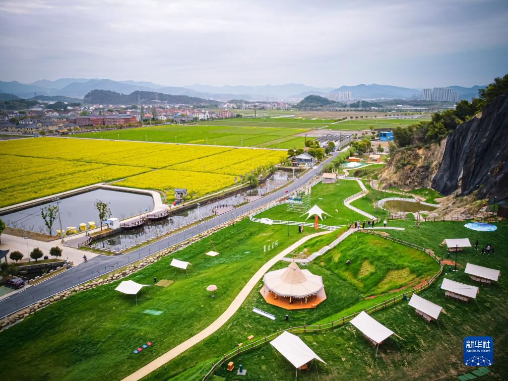 這是浙江省諸暨市楓橋鎮杜黃新村用廢棄礦山改造的露營(yíng)旅游地(3月29日攝,無(wú)人機照片)。