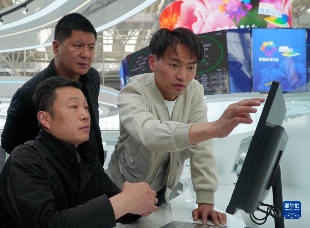 4月9日,在昆明國際花卉拍賣(mài)交易中心菏澤分中心,參觀(guān)者在了解花卉拍賣(mài)系統。