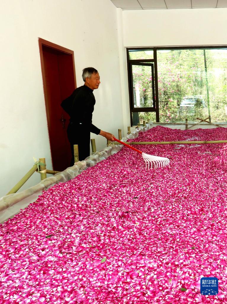 4月9日,在四川省眉山市仁壽縣藕塘鎮,村民在晾曬玫瑰花。