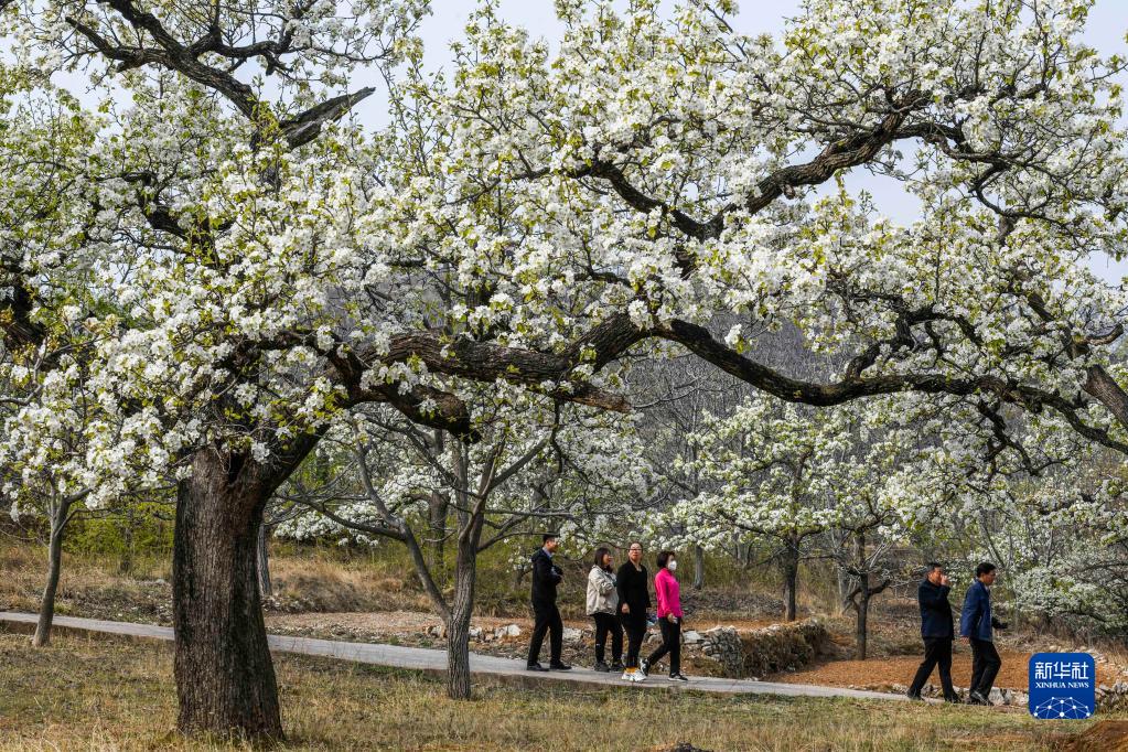 4月9日,游客在河北省遷西縣東蓮花院鎮西山村梨樹(shù)果園賞花游玩。
