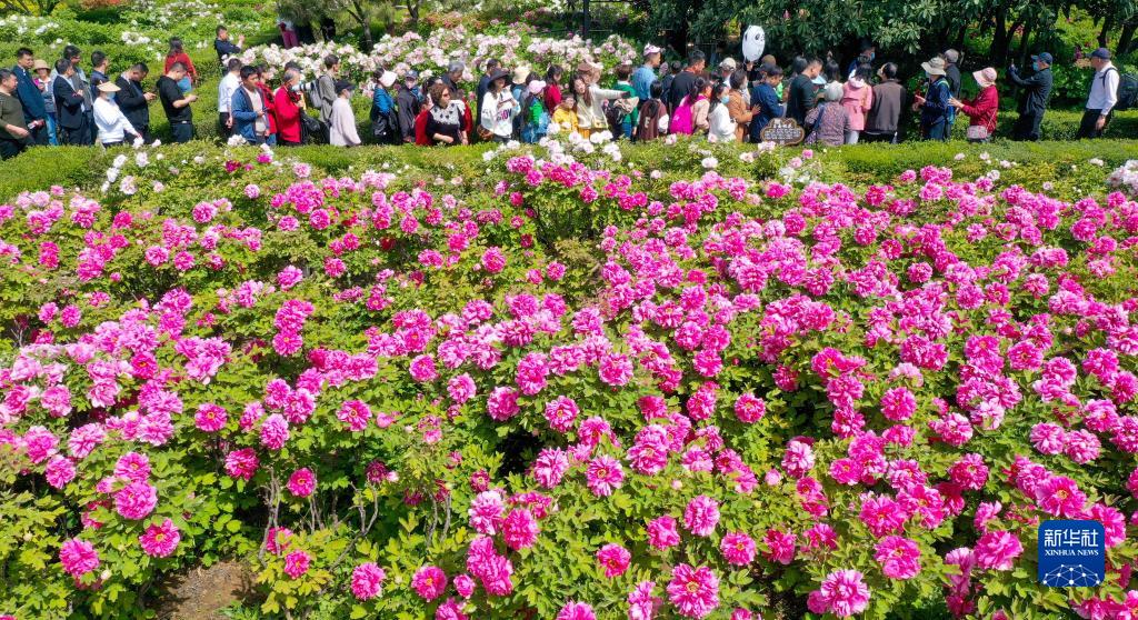 4月9日,游客在河南省洛陽(yáng)市一牡丹觀(guān)賞園內觀(guān)賞牡丹(無(wú)人機照片)。