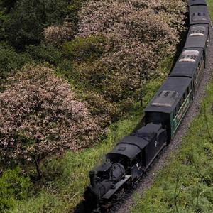 近日,四川省樂(lè )山市犍為縣桐子花盛開(kāi),當地著(zhù)名的老式窄軌蒸汽火車(chē)——嘉陽(yáng)小火車(chē)穿越桐子花叢,鳴笛噴氣,在陽(yáng)光照射下形成一道彩虹,令人驚嘆不已。